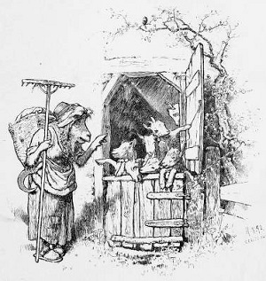 El lobo y los siete cabritillosUna madre sale de casa y advierte a sus hijos que no abran al lobo. Cuando el lobo viene le piden que muestre la patita por debajo de la puerta; después de varios intentos, el lobo los engaña embadurnando su pata de harina; entra y se los come a todos menos a uno que se refugia en la caja del reloj. Cuando vuelve la madre y el lobo está dormido después del festín, le abren la barriga, liberan a sus hermanos, y se la llenan de piedras.