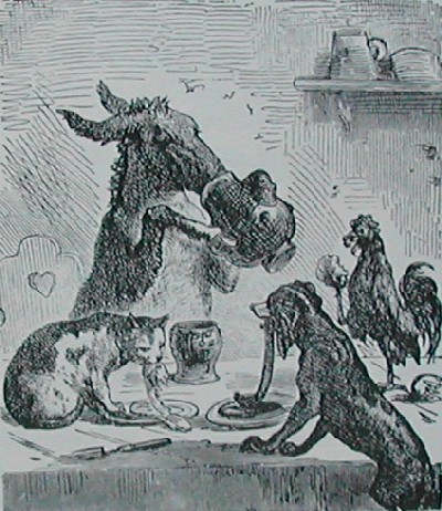 Los músicos de BremenUn asno que desea ser músico municipal en Bremen se une primero a un perro de caza viejo, luego a un gato y luego a un gallo. Llegan a una casa donde unos ladrones están comiendo, se asoman a la ventana colocados uno encima del otro y entonces los ladrones se asustan y salen corriendo. Cuando después vuelve uno de los ladrones lo encuentra todo en silencio: en ese momento el gato salta sobre él, el perro le muerde, el asno le cocea, el gallo grita «traédmelo aquí»…