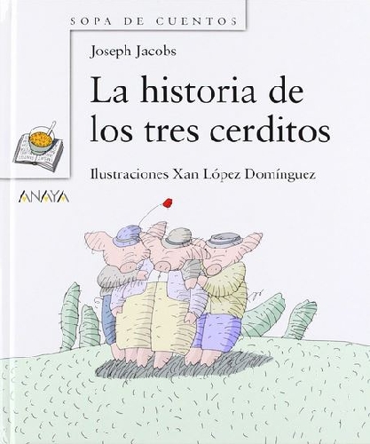 La historia de los tres cerditos, está en Madrid: Anaya, 2003; 23 pp.; col. sopa de cuentos, cuentos clásicos; ilust. de Xan López Domínguez; trad. de Fernando Santos; ISBN: 84-667-2553-9.